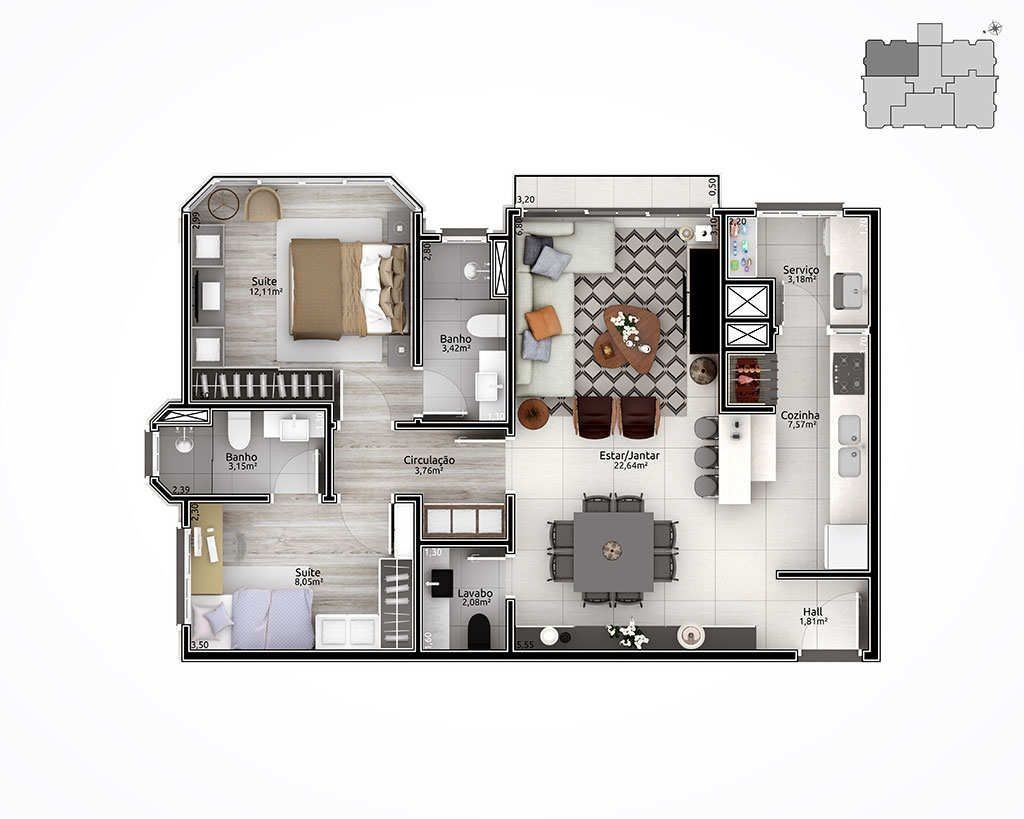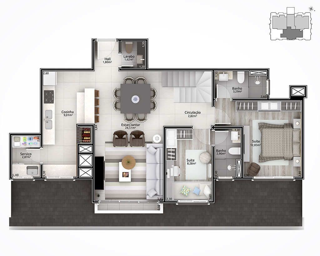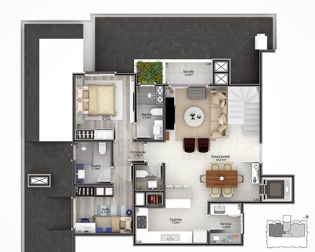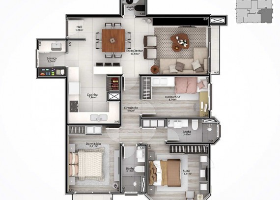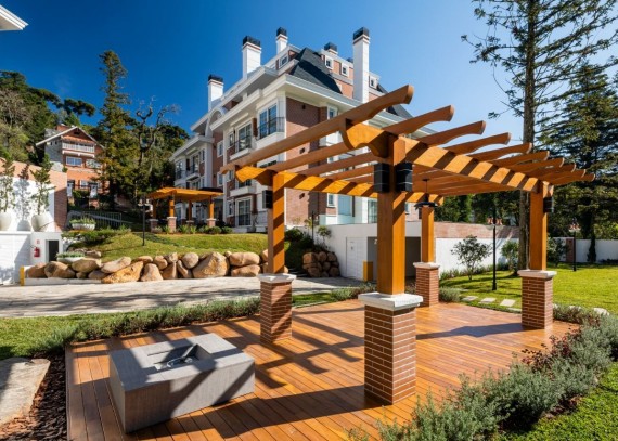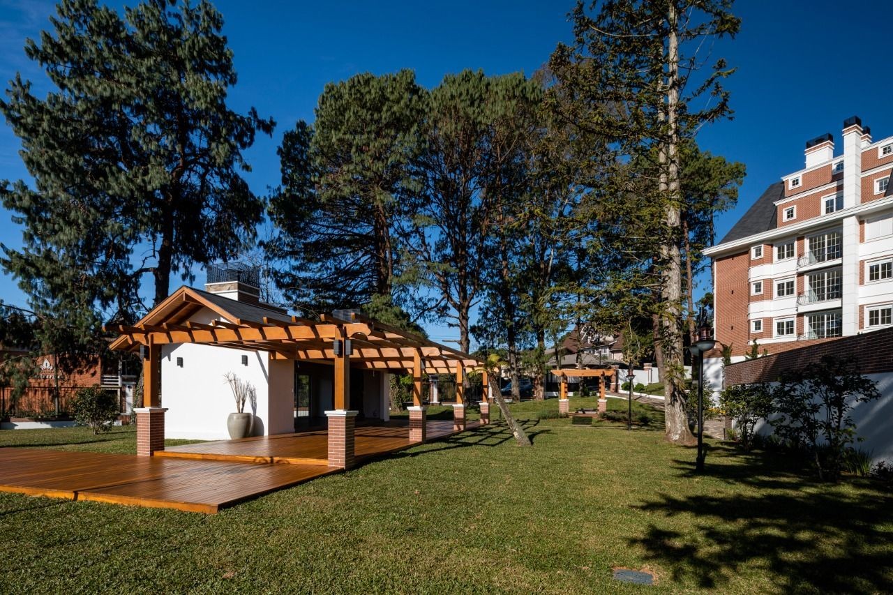 Empreendimento com aberturas externas de PVC com vidro duplo. Fachada estilo neoclássico inglês; Espera para automação residencial; Hall de entrada entregue mobiliado e decorado; Salão de festas mobiliado e equipado; Playground para crianças; Chimarródromo; totalmente cercado, entregue com sistema de vigilância para monitorar a distância.