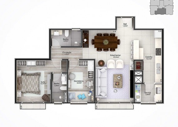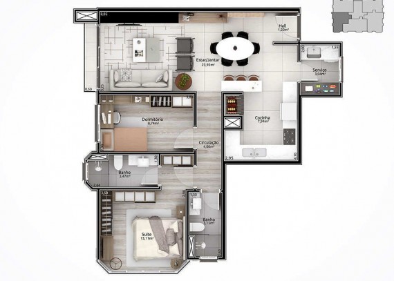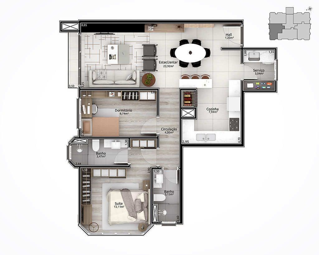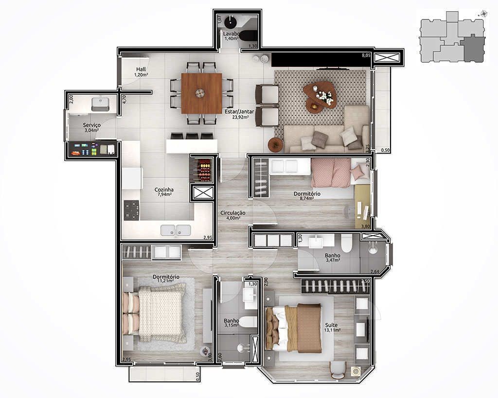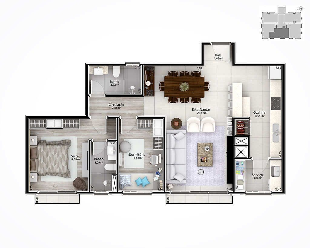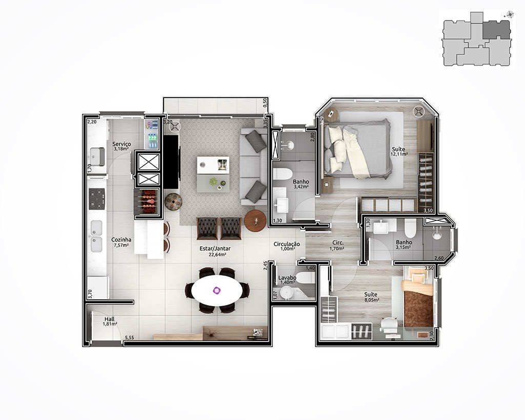 Empreendimento com aberturas externas de PVC com vidro duplo. Fachada estilo neoclássico inglês; Espera para automação residencial; Hall de entrada entregue mobiliado e decorado; Salão de festas mobiliado e equipado; Playground para crianças; Chimarródromo; totalmente cercado, entregue com sistema de vigilância para monitorar a distância.