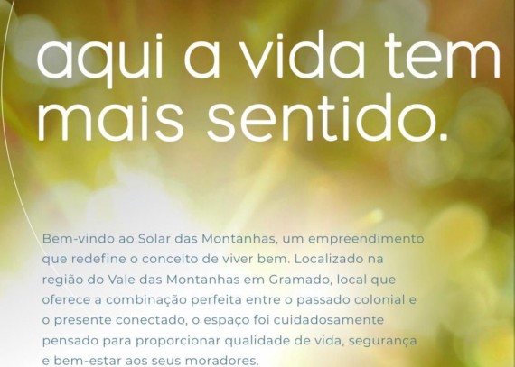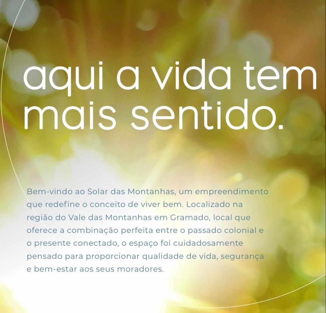 Solar das Montanhas, um empreendimento que redefine o conceito de viver bem. Localizado na região do Vale das Montanhas em Gramado, local que oferece a combinação perfeita entre o passado colonial e o presente conectado, o espaço foi cuidadosamente pensado para proporcionar qualidade de vida, segurança e bem estar dos seus moradores. Total de 82 unidades com metragens 200 a 1640m. Parcelamento direto com a loteadora até 60 meses. Entre em contato para maiores informações. 54-99159-9050.