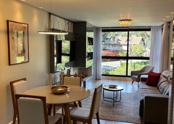 SOLUCIONE IMÓVEIS VENDE: Charmoso Apartamento MOBILIADO, localizado próximo ao Centro de Gramado. No Bairro Bavária, local encantador que você e sua família poderão desfrutar toda tranquilidade e bem-estar. Apartamento com amplo estar e jantar com sacadas integradas, 2 suítes, lavabo, lareira, calefação e Split. 2 Box.