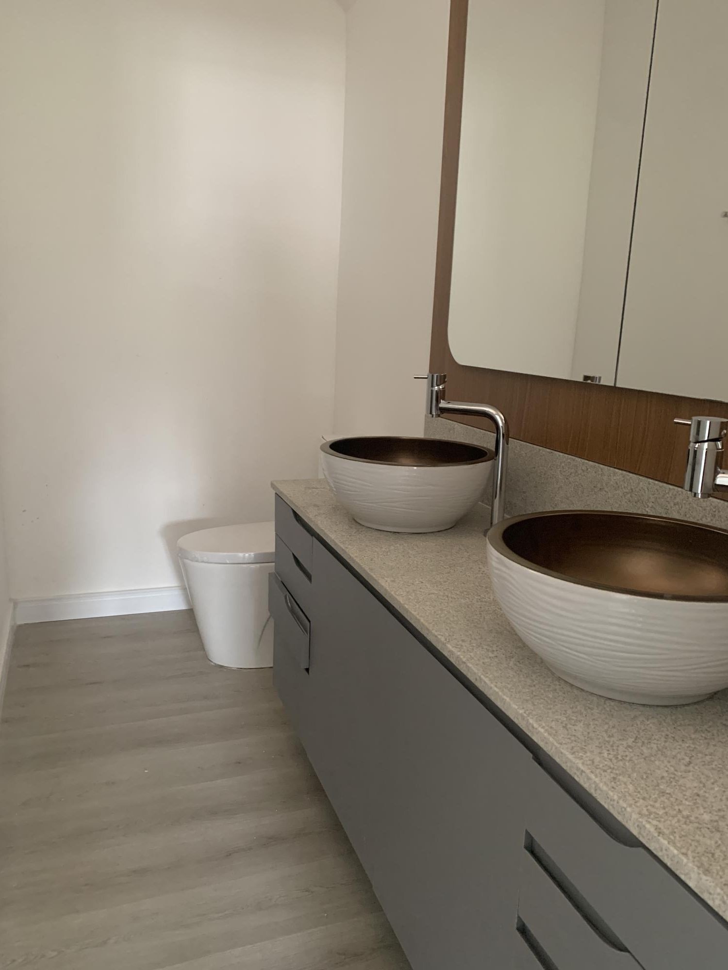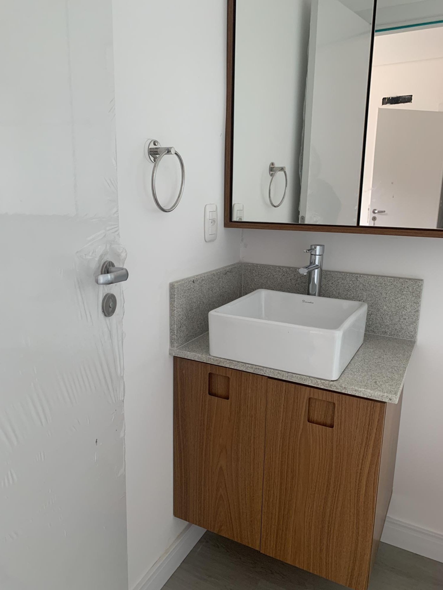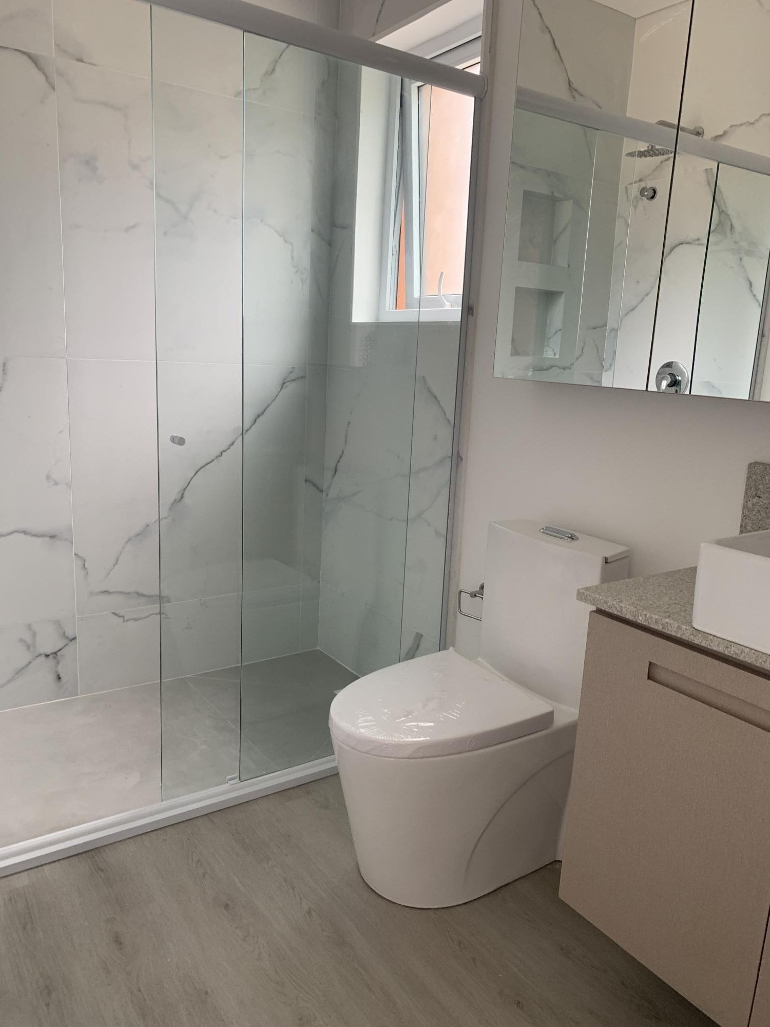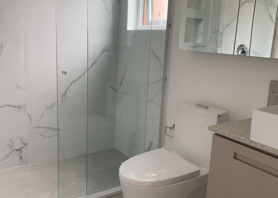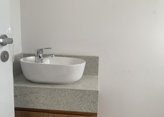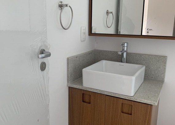 -Banheiros completos com box de vidro temperado, balcão, espelho e metais.