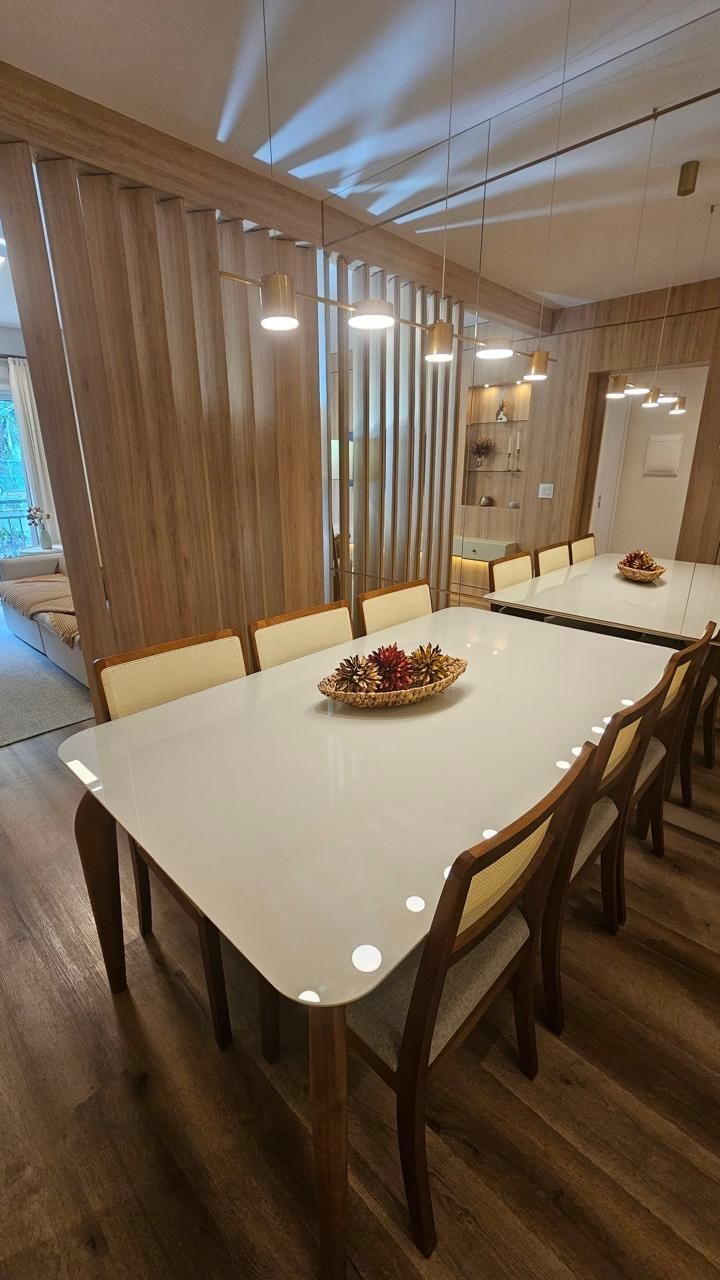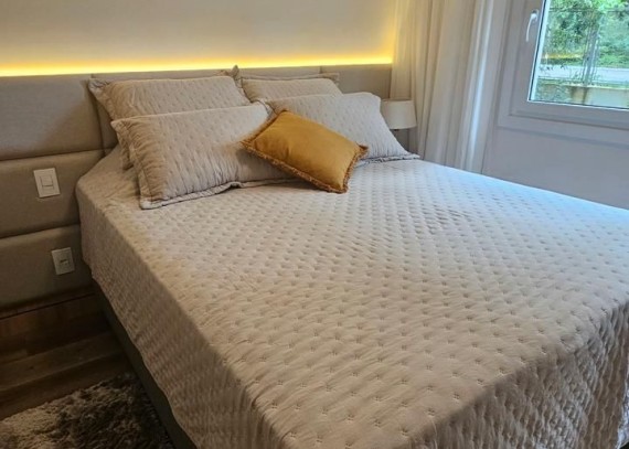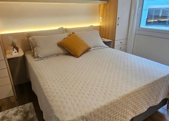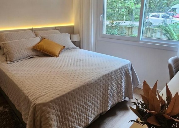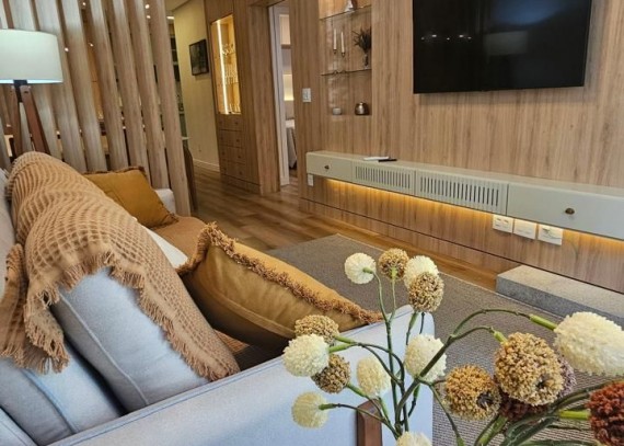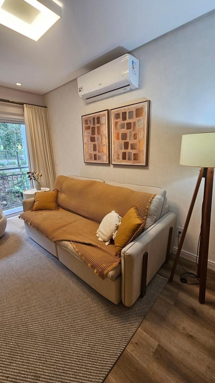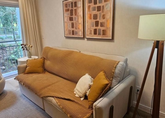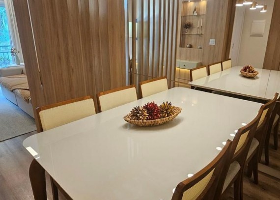 SOLUCIONE IMÓVEIS VENDE: Apartamento MOBILIADO em Bairro NOBRE com 2 suítes, lavabo, 1 vaga de garagem. Espera de lareira e Split, piso laminado e porcelanato, esquadrias em PVC com vidros duplos.