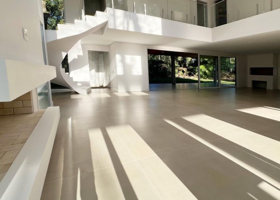 Piso em porcelanato e piso vinílico.