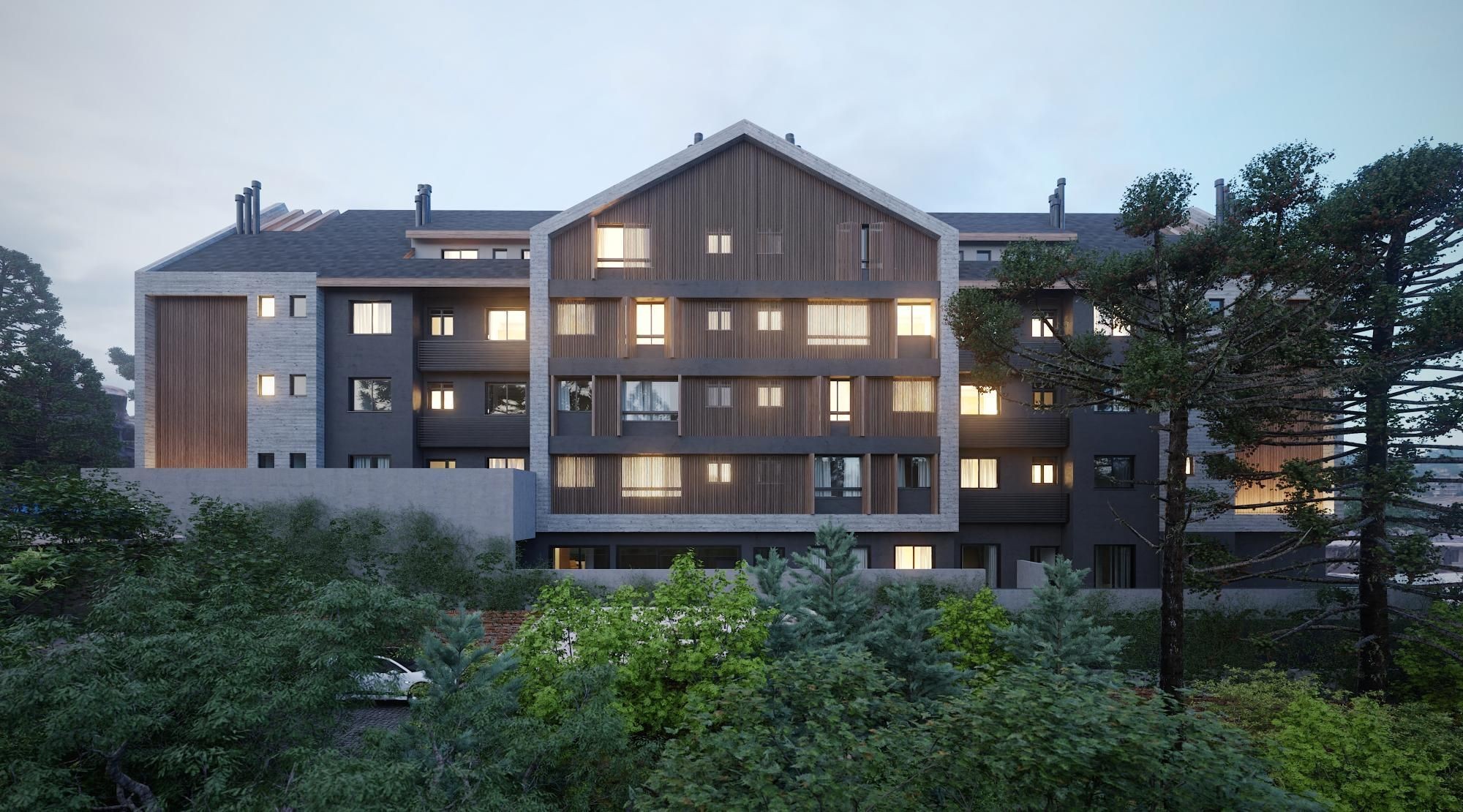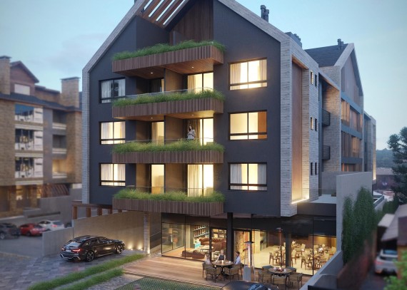 Empreendimento Garbo Canela, apartamentos de 2 dormitórios (01 suíte) com Garden, 02 suítes e 3 dormitórios (02 suítes americana), amplo espaço interno, esperas para split, calefação e lareira, 1 vaga de garagem, no centro de Canela, a poucas quadras da Catedral de Pedra.