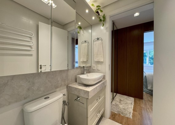 Empreendimento contém piso vinilico colado na sala, circulação e dormitórios, porcelanato nas áreas úmidas e sacadas. Esquadrias em PVC, vidros duplos, living cm espera para lareira, cozinha com churrasqueira, Laje com tratamento para atenuação de ruídos de impacto, infraestrutura para ar condicionado no living e dormitórios, teto com rebaixo de gesso.