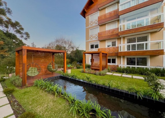 Empreendimento contém piso vinilico colado na sala, circulação e dormitórios, porcelanato nas áreas úmidas e sacadas. Esquadrias em PVC, vidros duplos, living cm espera para lareira, cozinha com churrasqueira, Laje com tratamento para atenuação de ruídos de impacto, infraestrutura para ar condicionado no living e dormitórios, teto com rebaixo de gesso. Uma maravilhosa área comum cerca de 4.000m² de jardim contando com uma diferenciada infraestrutura de lazer, horta comunitária, Pomar com arvores frutíferas, área para piquenique, pergolados de contemplação, espelhos d'agua, salão de festas com espaço gourmet ( entregue mobiliado) espaço Parilha ao ar livre, Fire pit, Playground, academia pet, academia ao ar livre.