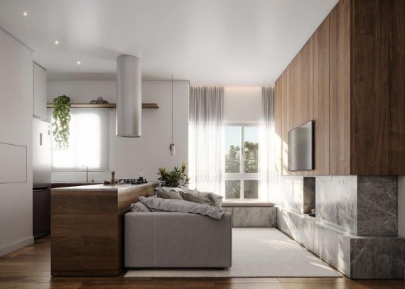Cozinha com churrasqueira integrada à área social.
