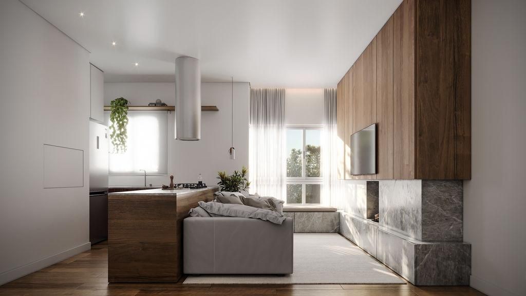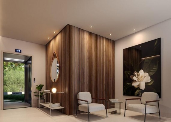 Área social, dormitórios e cozinha serão entregues com piso vinílico, enquanto os banhos receberão piso porcelanato aquecido.