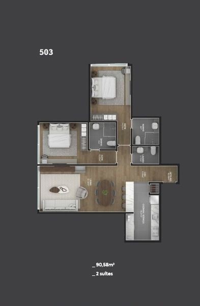 Apartamento composto por duas suítes, lavabo, cozinha com churrasqueira e área de serviço, sala de estar, sala de jantar e uma vaga de garagem.