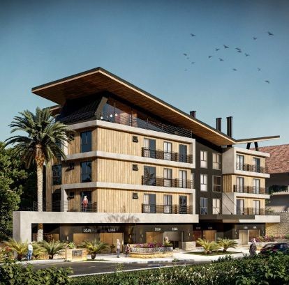 Empreendimento Na fachada, revestimento em pinus autoclavado, pedra natural e esquadrias em alumínio.
