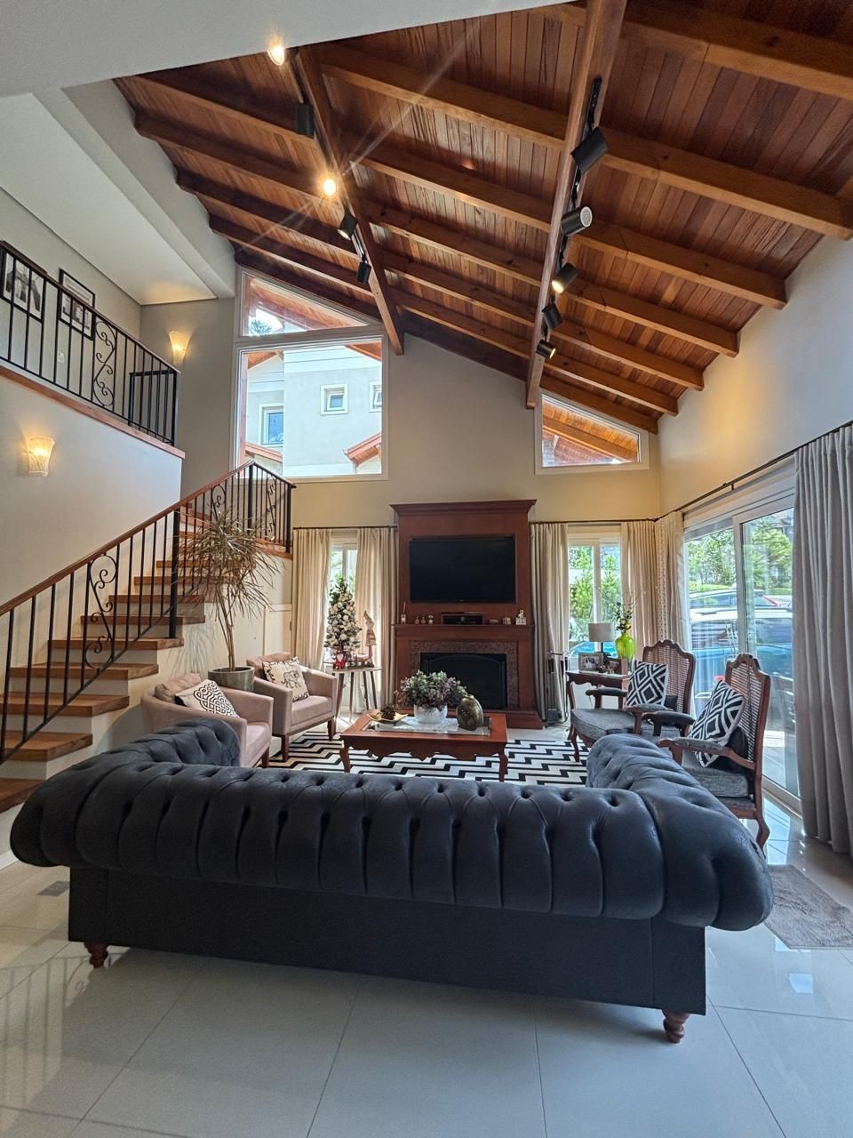 ✨ Living imponente com lareira e pé-direito duplo