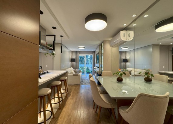 Empreendimento contém piso vinilico colado na sala, circulação e dormitórios, porcelanato nas áreas úmidas e sacadas. Esquadrias em PVC, vidros duplos, living cm espera para lareira, cozinha com churrasqueira, Laje com tratamento para atenuação de ruídos de impacto, infraestrutura para ar condicionado no living e dormitórios, teto com rebaixo de gesso. Uma maravilhosa área comum cerca de 4.000m² de jardim contando com uma diferenciada infraestrutura de lazer, horta comunitária, Pomar com arvores frutíferas, área para piquenique, pergolados de contemplação, espelhos d'agua, salão de festas com espaço gourmet ( entregue mobiliado) espaço Parilha ao ar livre, Fire pit, Playground, academia pet, academia ao ar livre.