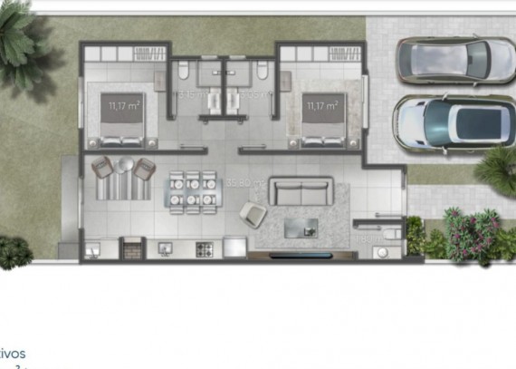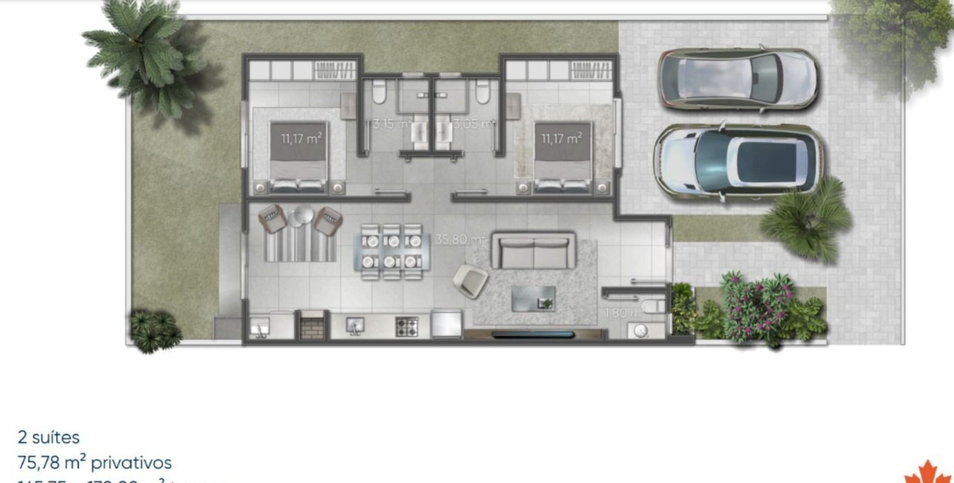 móveis soltos da SIERRA), living integrado para 3 ambientes, banheiro e 2 dormitórios. A residência conta com 1 ou 2 vagas de garagem, lazer