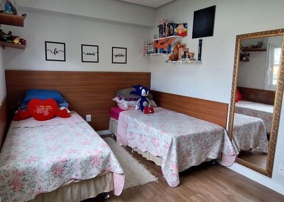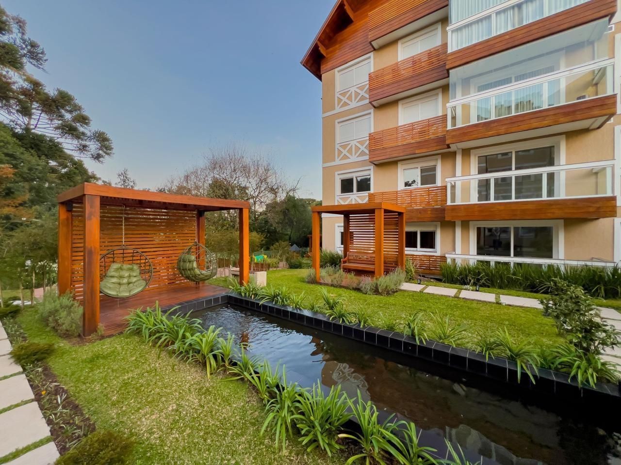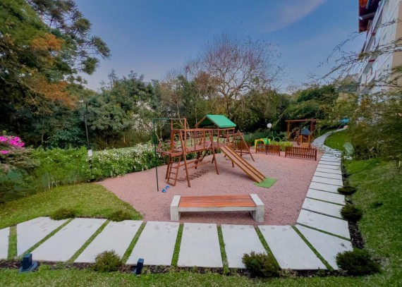 Empreendimento contém piso vinilico colado na sala, circulação e dormitórios, porcelanato nas áreas úmidas e sacadas. Esquadrias em PVC, vidros duplos, living cm espera para lareira, cozinha com churrasqueira, Laje com tratamento para atenuação de ruídos de impacto, infraestrutura para ar condicionado no living e dormitórios, teto com rebaixo de gesso. Uma maravilhosa área comum cerca de 4.000m² de jardim contando com uma diferenciada infraestrutura de lazer, horta comunitária, Pomar com arvores frutíferas, área para piquenique, pergolados de contemplação, espelhos d'agua, salão de festas com espaço gourmet ( entregue mobiliado) espaço Parilha ao ar livre, Fire pit, Playground, academia pet, academia ao ar livre.