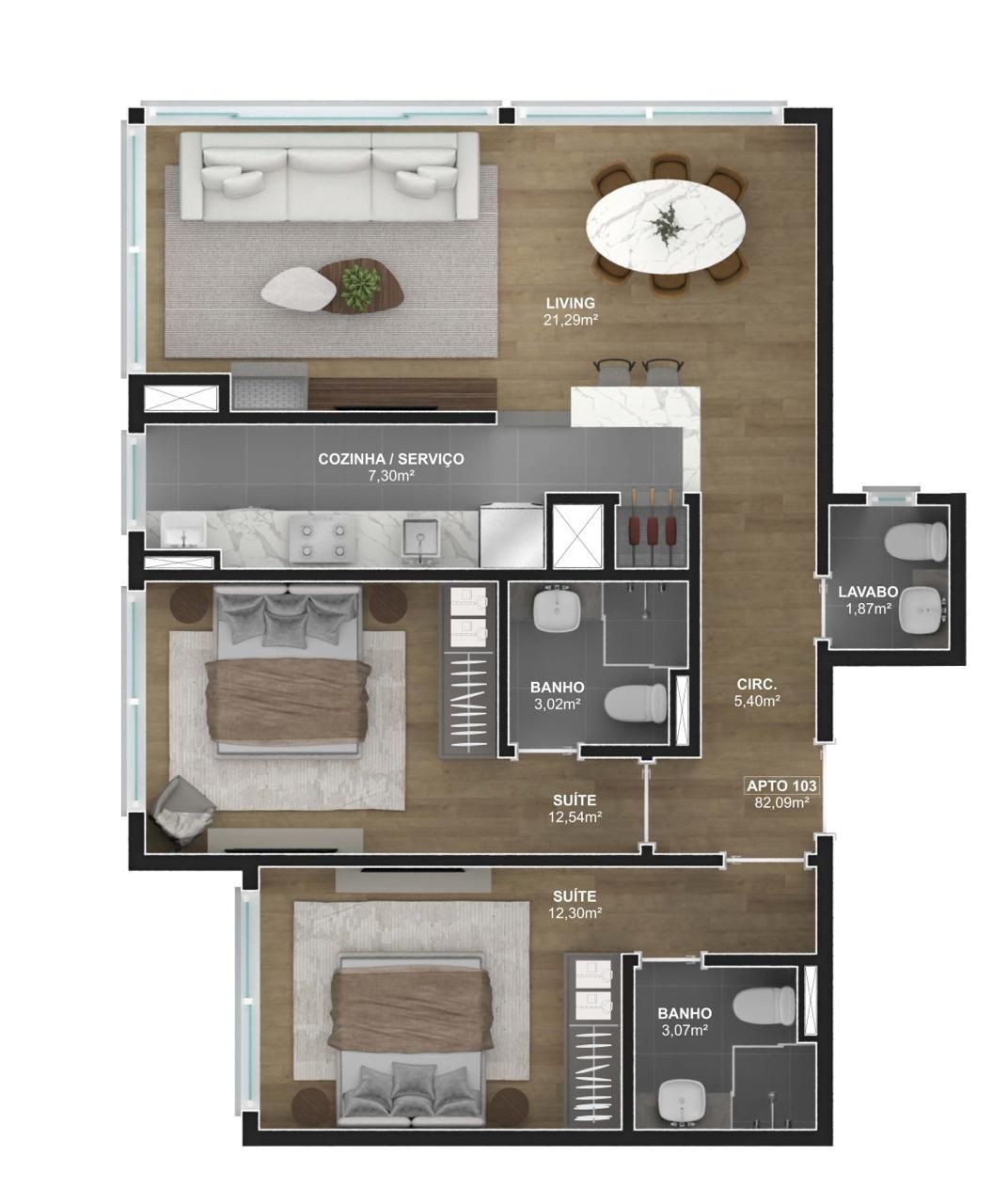 Duas suítes mais lavabo, excelente iluminação natural e janelas piso-teto em todo o living, com vista para o jardim do empreendimento.