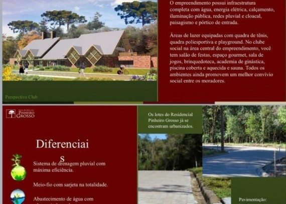 SOLUCIONE IMÓVEIS VENDE: No residencial Pinhiero Grosso respeito ao meio ambiente, refinamento técnico, perfeição no acabamento e baixo custo de manutenção são compromissos permanentes. Toda estrutura e tranquilidae para viver sua natureza. Lazer e Segurança completos. Clube Social equipado com: salão de festas, espaço gourmet, sala de jogos, brinquedoteca, academia de ginástica, piscina coberta e aquecida, sauna, quadra de tênis, quadra de futebol e playground.